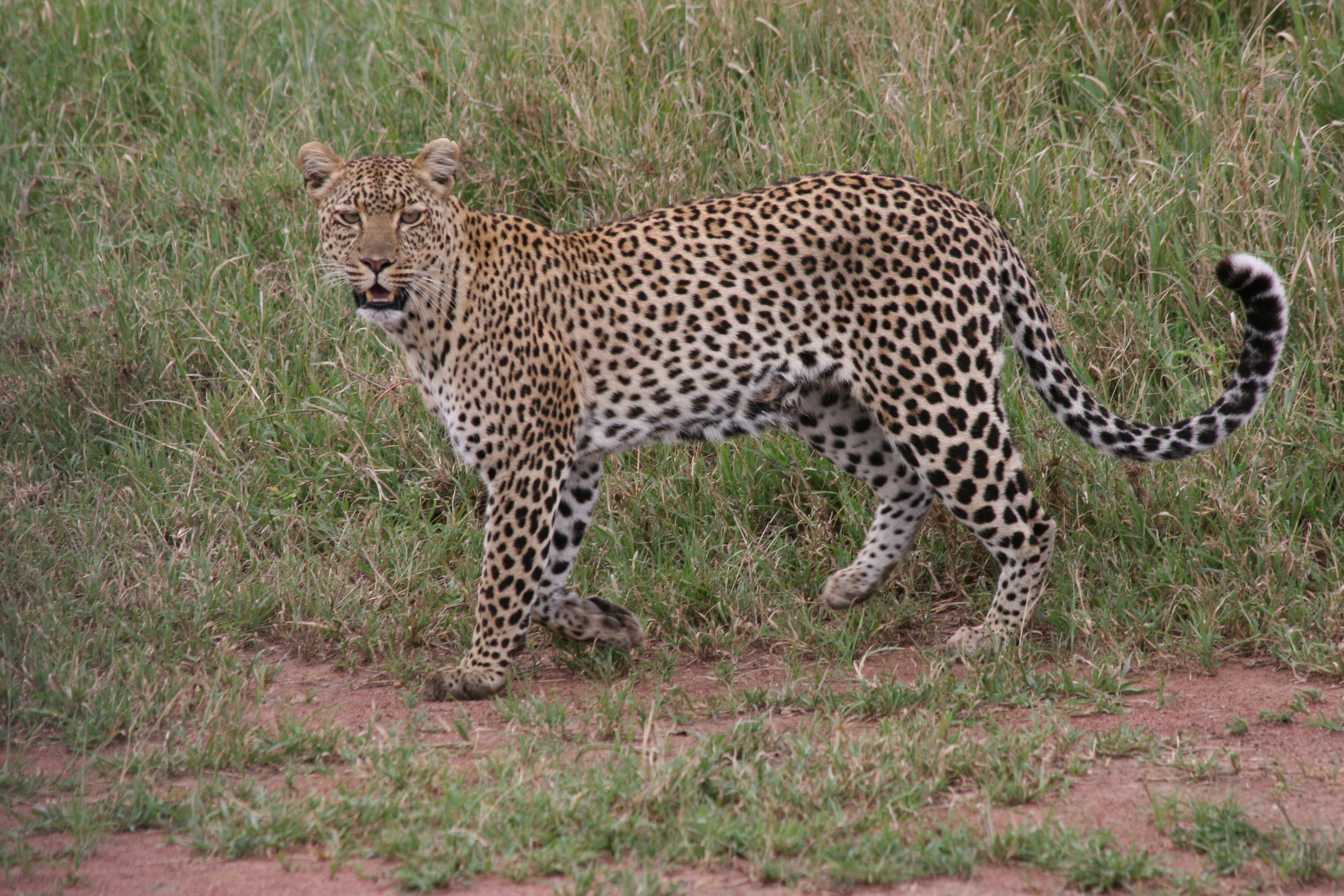 On Friday we saw more elephants and took more pictures — you just can’t have enough elephant pictures! Then, Masha spotted two baby leopard in the crook of a tree not too far from the road. We stopped to take pictures, watching as one of the babies ventured down the tree onto the ground. It was interesting to see him start down head first, quickly realizing that was not going to end well, he turned around and went down feet first, with great success! We wondered where Mom was, as we could not see her anywhere. We assumed she was in the tall grass around the tree, so we moved on down the road. We soon happened upon Mom quite a ways down in the grass. We couldn’t get very good pictures of her, but took many shots anyway of her walking through the grass. We continued on our drive looking for other animals, then spotted Mom again coming across the grass, straight toward us on a road parallel to the one where we first saw her. As luck would have it, this beautiful creature walked slowly and deliberately directly in front of our Land Cruiser. In fact, she stopped and turned to look directly at us, before sauntering on. Woohoo!!! Four down, one to go!