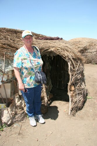 It is believed that the Maasai people originally came from Egypt or Sudan approximately 200 years ago, traveling into Northern Africa looking for water and greener pastures for their cows. They are the only tribe that has maintained their original culture and customs, living in small villages with multiple wives and a specified hierarchy that includes a chief. There is no electricity, plumbing, or running water and lodging consists of very small huts made of sticks, straw and any other material that is handy. Think of a walk-in closet that is 5 feet tall. They cook on small fires in the center of their hut in steel pots that look 20 years old. We wondered how they tolerated the smoke from the fires, which must completely fill the small area whenever a fire is lit. Michael observed that the walls were not solid, allowing some smoke to escape, but with no chimney, it had to be suffocating at times. Their beds were off the floor (on sticks) made from tree branches covered in cow hide, flattened cardboard boxes or a combination of the two; with the adult bed being the size of a small twin bed and the chidren’s bed even smaller. A Maasai man can marry up to 10 wives; however he has fewer children these days as the government now mandates schooling for ALL African children. Although public school is free, it is expensive to clothe the children and transport them the many miles into town. Having said that, it is painfully obvious that this law is often not enforced, as there are school aged children tending herds and milling about during school hours. Masha indicated that educating the Maasai people is beginning to make some positive changes. For example, castrating women has become rare. Boys are still castrated during ceremonies and they are required to wear white face paint for three months, after which a huge celebration takes place welcoming them into manhood. This ritual usually takes place between 12-15 years of age, but can occur as early as 8. They used to go out and kill a lion at the end of the three-month period to prove their manhood; however, such killing is no longer allowed. Now they wear red head covers and dreadlocks, which are meant to resemble the lion’s mane. The Maasai own the land where tanzanite is mined so they are a wealthy tribe. Basd on what we saw, it is a mystery where all the money goes. The village we visited had a small, one room schoolhouse for the 5-6 year olds. The children sang songs to us, including the ABC song. They learn their ABCs and how to count to 100 in English. They are very sweet, but are not clean and wear clothing that has clearly been donated (we saw a child with a sweatshirt on and one with what looked like a pair of pajamas, T-shirts, etc.). They do not wear underwear, we presume to make elimination easier. They sat in the dirt (we did not see one chair or other piece of furniture, except the “beds”) or on Mom’s hip. They had no reaction to the flies that landed on their eyes, noses, or mouths. The men get one hut for each wife and spends time with them in those huts. They eat mostly beef and goat, and drink milk and blood. They eat very little fruit or vegetables. They are very tall and thin and their teeth are in terrible shape or missing altogether. They walk miles to other villages and we would see them walking across the plain or in the hills, in their brightly colored ground-length robes. They are partial to bright red. When they want to move to another village (which happens often), they leave everything taking only the clothes on their back and their walking stick. When they arrive at the new village, they are welcomed and given a hut to live in. The hut they left is available for another traveler to occupy.