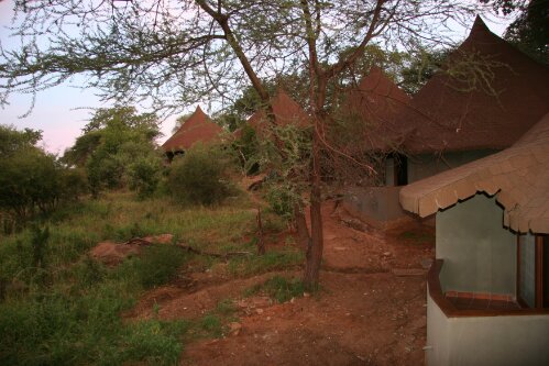 Ironically, we saw more game on the transit drive in the afternoon than on the morning game drive. Lots of wildebeest, though the migration is north of here right now. As a result, we only say groups of a few hundred instead of the uncountable thousands in the migration. One highlight of the drive were a lioness about 5 yards off the road who let us stare and take pictures for quite a while before disappearing into the grass. The other, more amazing, event was our encounter with a newborn wildebeest. We saw the mother just standing up, and the calf at the edge of the road, still covered with … well, you know. We watched the calf get up take its first steps, which happens about three minutes after birth. The group of half a dozen or so wandered off, their newest member a little unsteady, but keeping up.