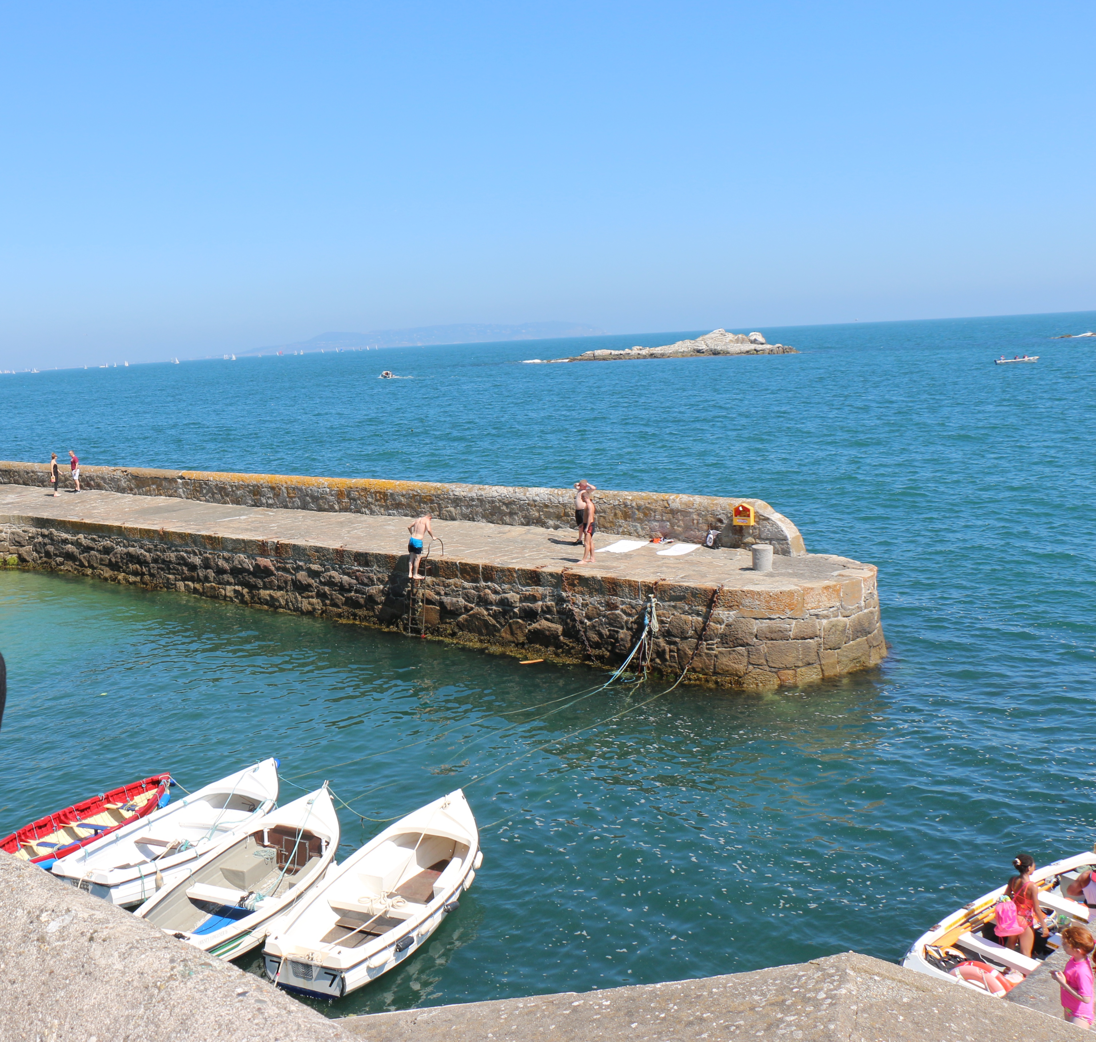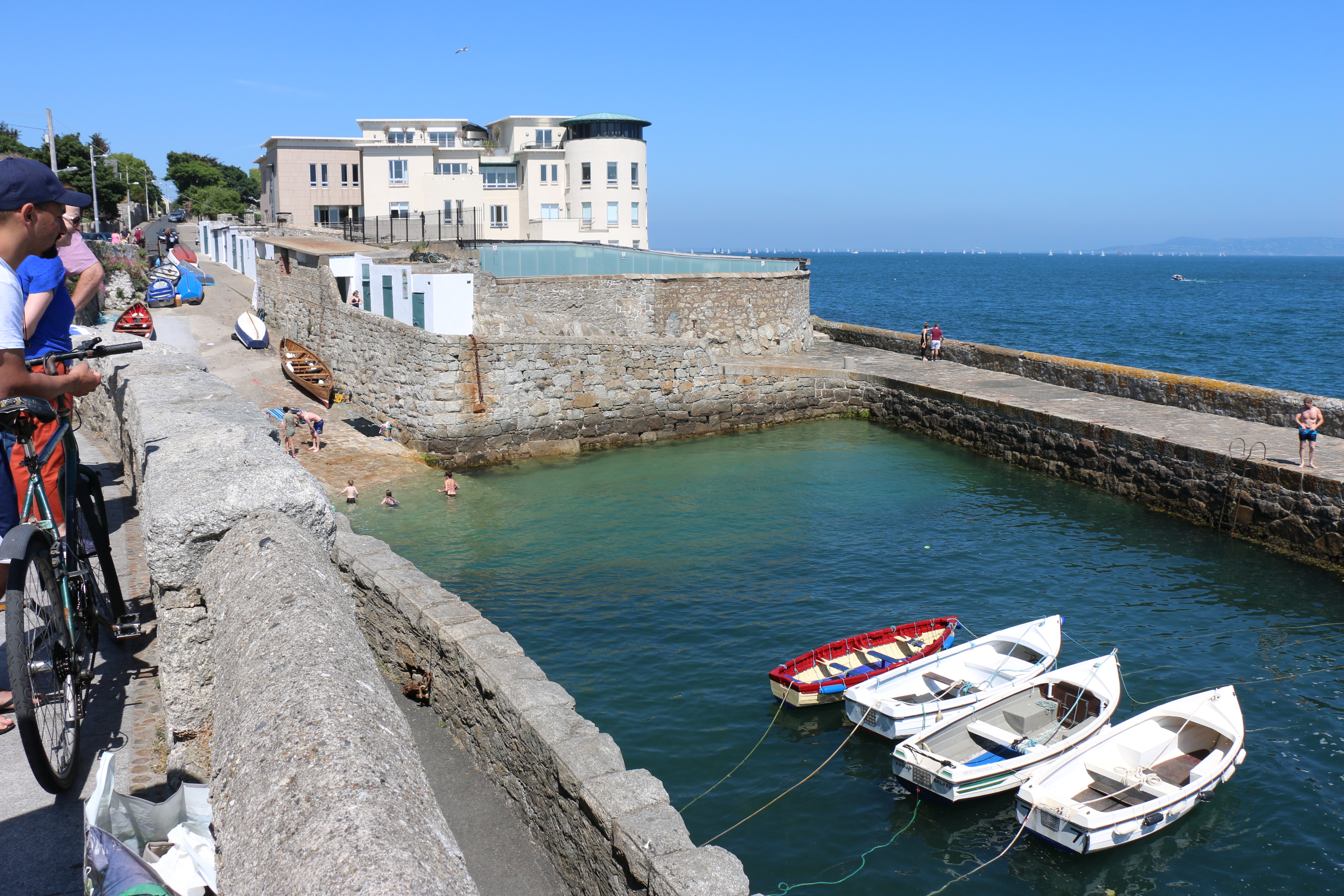 After breakfast at our new favorite place, The Queen of Tarts, we walked to the Pearse Street Station and Kenzie figured out how to buy tickets.  As we were waiting for our train, I asked a young Irish Train Attendant if we were on the right train and he proceeded to assure us we were and then gave us lots of information about Dalkey and where to go while there.  After a short ride we arrived and walked to the Coliemore Harbour, where the locals were enjoying the unusually warm weather.