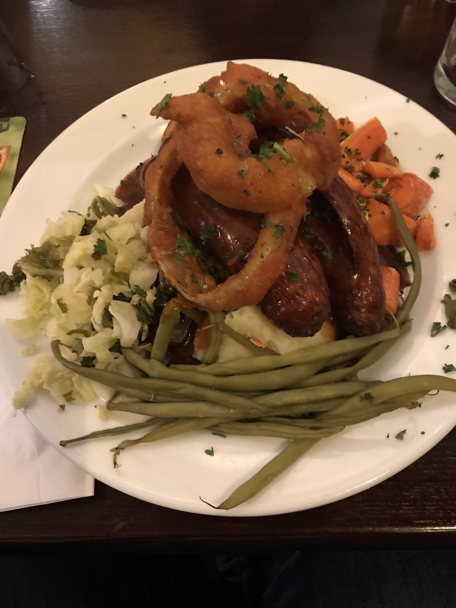 Bangers and Mash w/onion rings and green beans and cabbage.