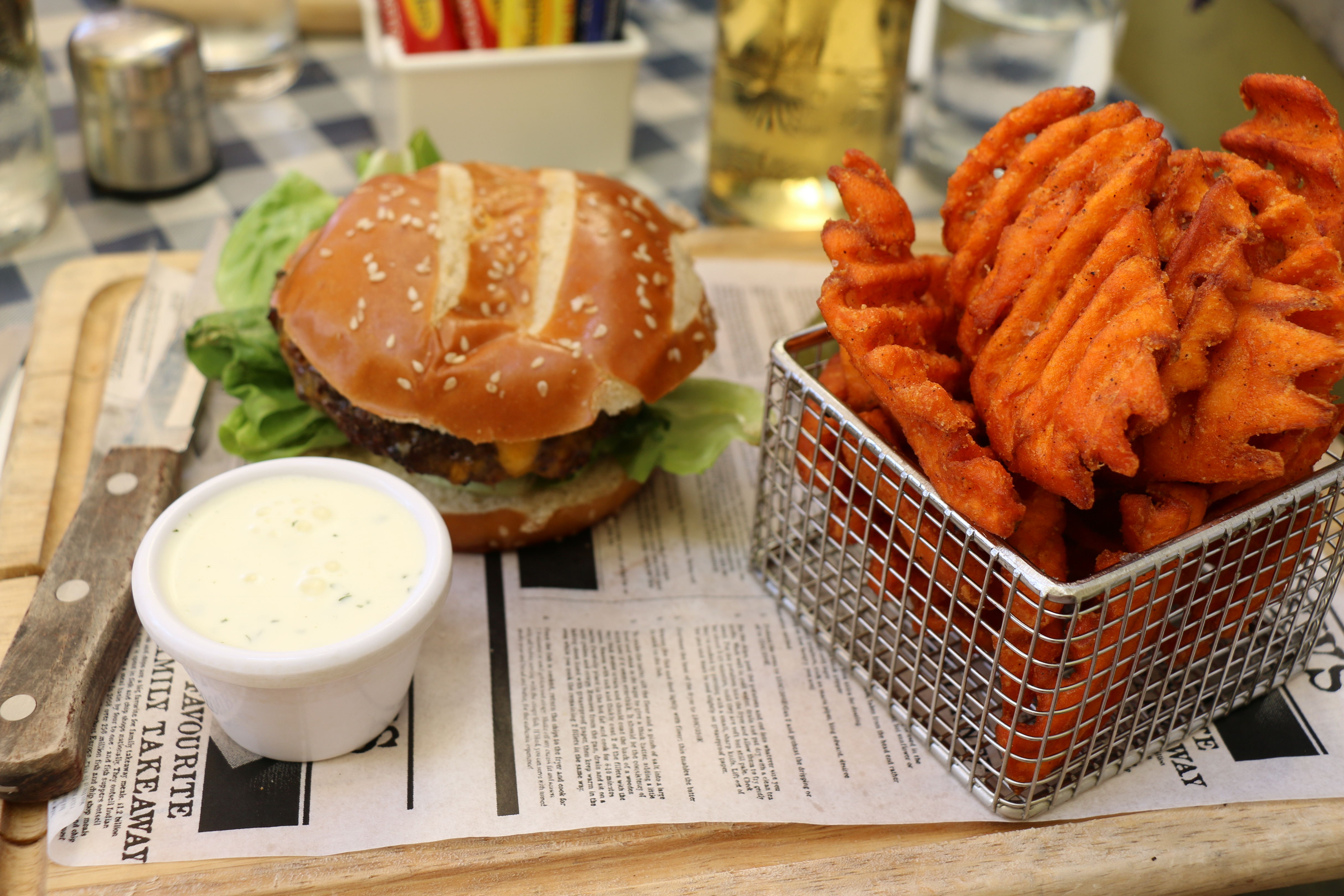 Having lunch at the Queen’s Bar. We got one of the spots in the shade.