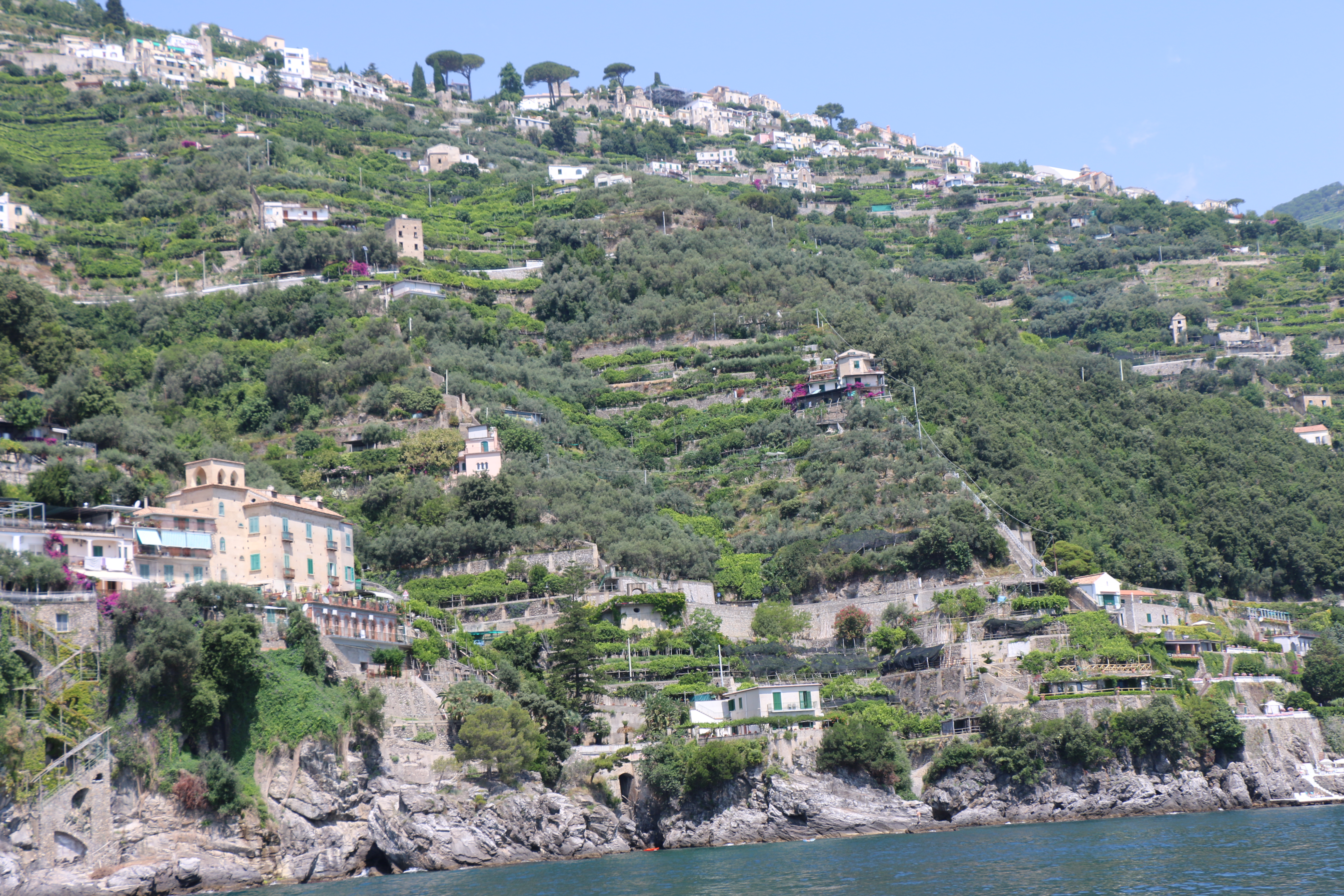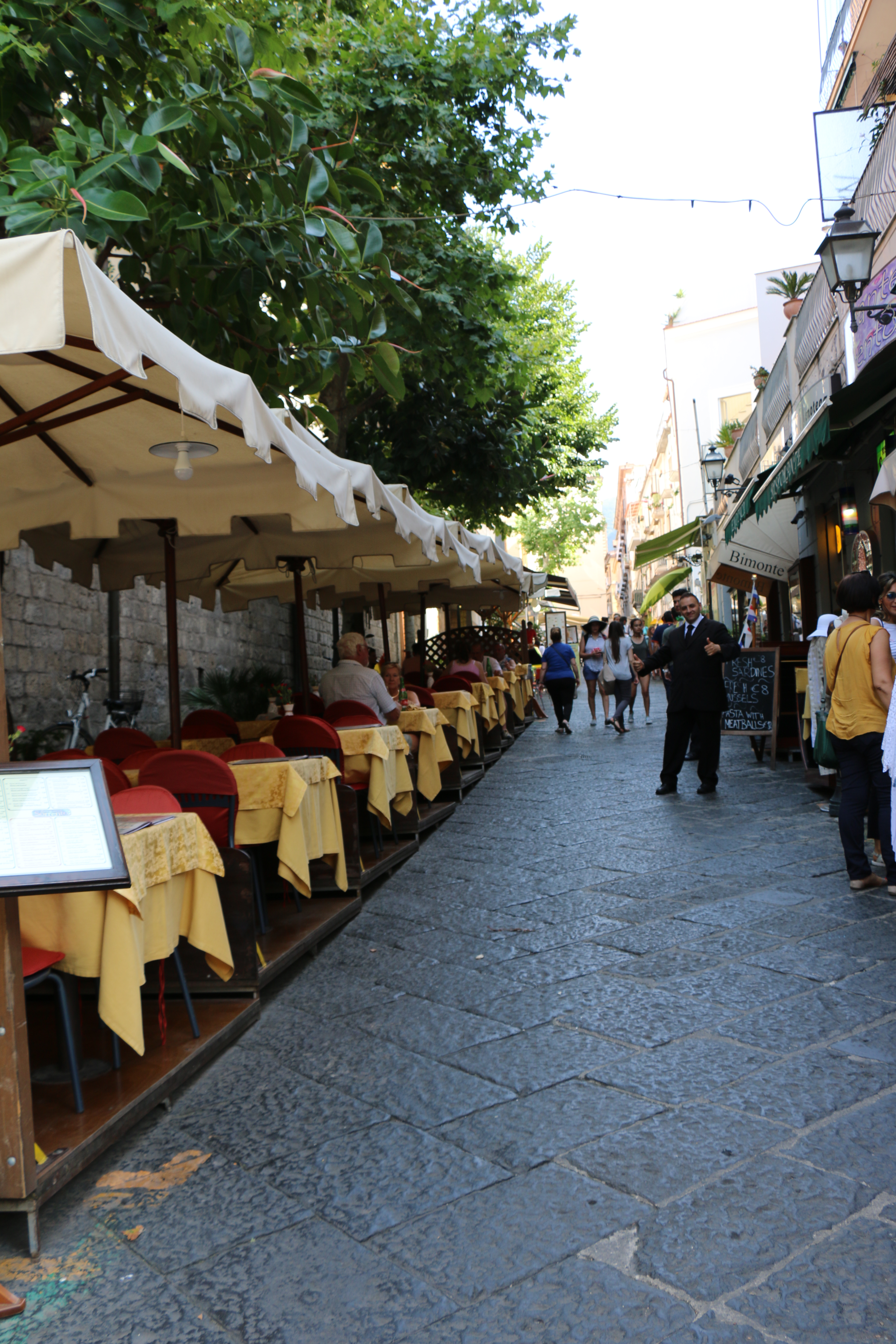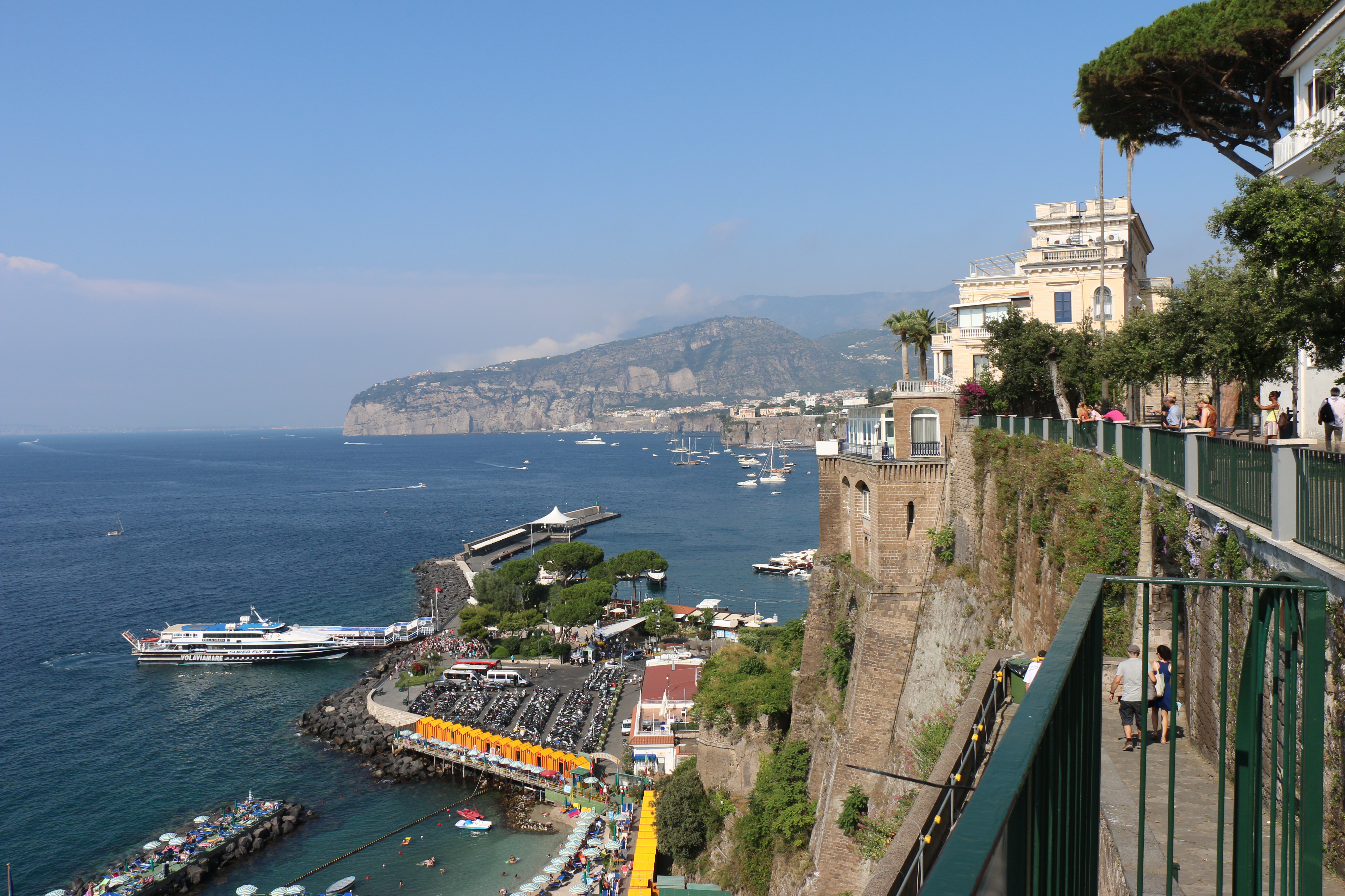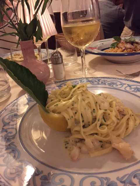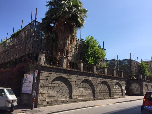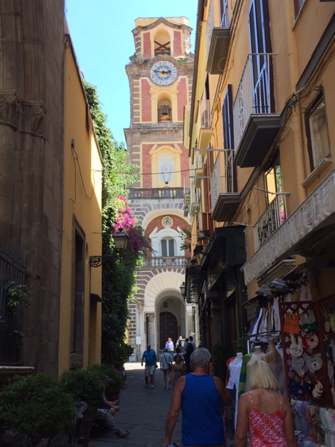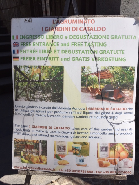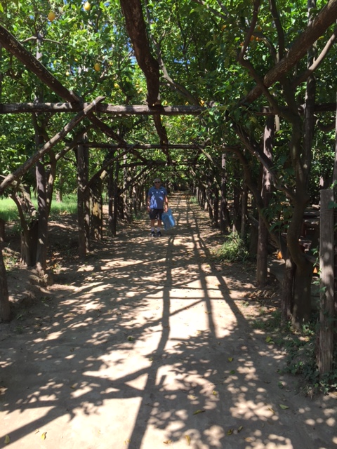 Saturday, the four of us (Hailey’s classmate Holly, Hailey, Michael and I) headed out at 9 am to have a Sorrento “Farm Experience”. We arrived at the lemon and olive orchard and were met by our guide, Claudia. She walked us through the orchard, providing lots of good information about the trees, showing us some that were over 200 years old. They do not use irrigation and she explained that the trees can survive on very little water if you never give them too much. Last year they only had 7 days of rain, but the orchard is covered in lemons! We then tasted their limoncello and seven flavors of olive oil, accompanied by some wonderful fresh lemonade. Once we were done with that, we were picked up by scooter trucks! These are vespas that have a golf cart-like passenger hauler placed on them. We were taken to the Restaurant and the family who owns the restaurant explained how their Pizze is made. We donned aprons and rubber gloves and were each given a ball of dough to work into a 12″ Marguerite pizze with sauce, tomatoes, mozzarella cheese, and basil. It was really fun, they played Italian music and each person had to throw their dough to the person across from them. Yes, a couple were dropped on the floor. But they just grabbed another ball of dough and carried on! We had to do it in shifts, but since the pizze’s are cooked for only 2 minutes at 800 degrees, it didn’t take long! It was delicious. We were then taken, by the same scooter/carts to the barns, where we met the dairy cows and were schooled on how mozzarella, ricotta, and cacciottine cheese are made. Claudia made small tomato and basil salads to go with our 3 kinds of cheese sample! Home made red wine was Included with the pizza and cheese sampling! It was especially nice to learn that all their products (i.e., orchards, cows and food ingredients) are completely certified organic. While very informative and fun, it was a very humid hot day, so we were all exhausted when we got back. It has become increasing clear why the Italians take pausa pranzo (lunch pause) every day! We have adopted this practice with ease.