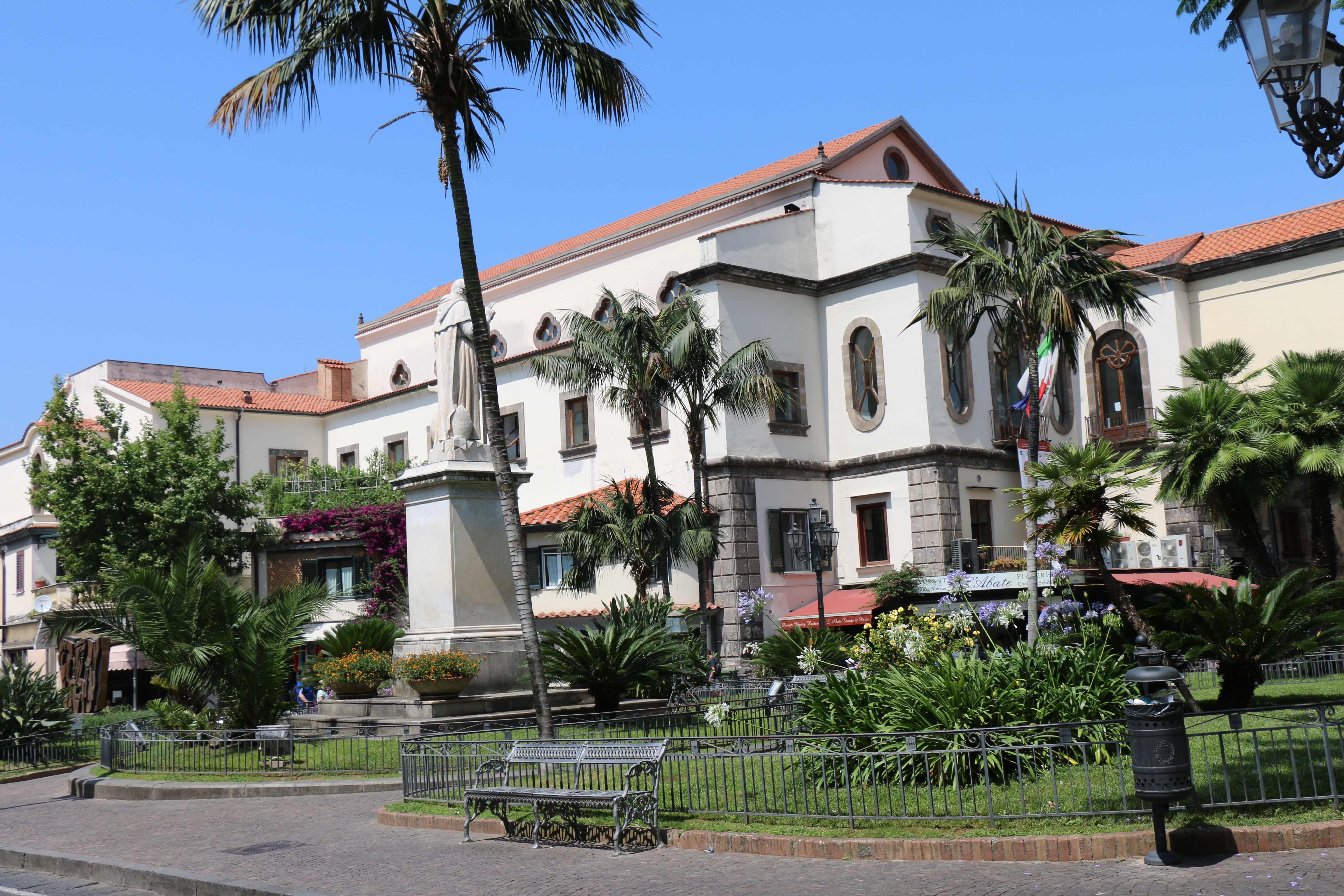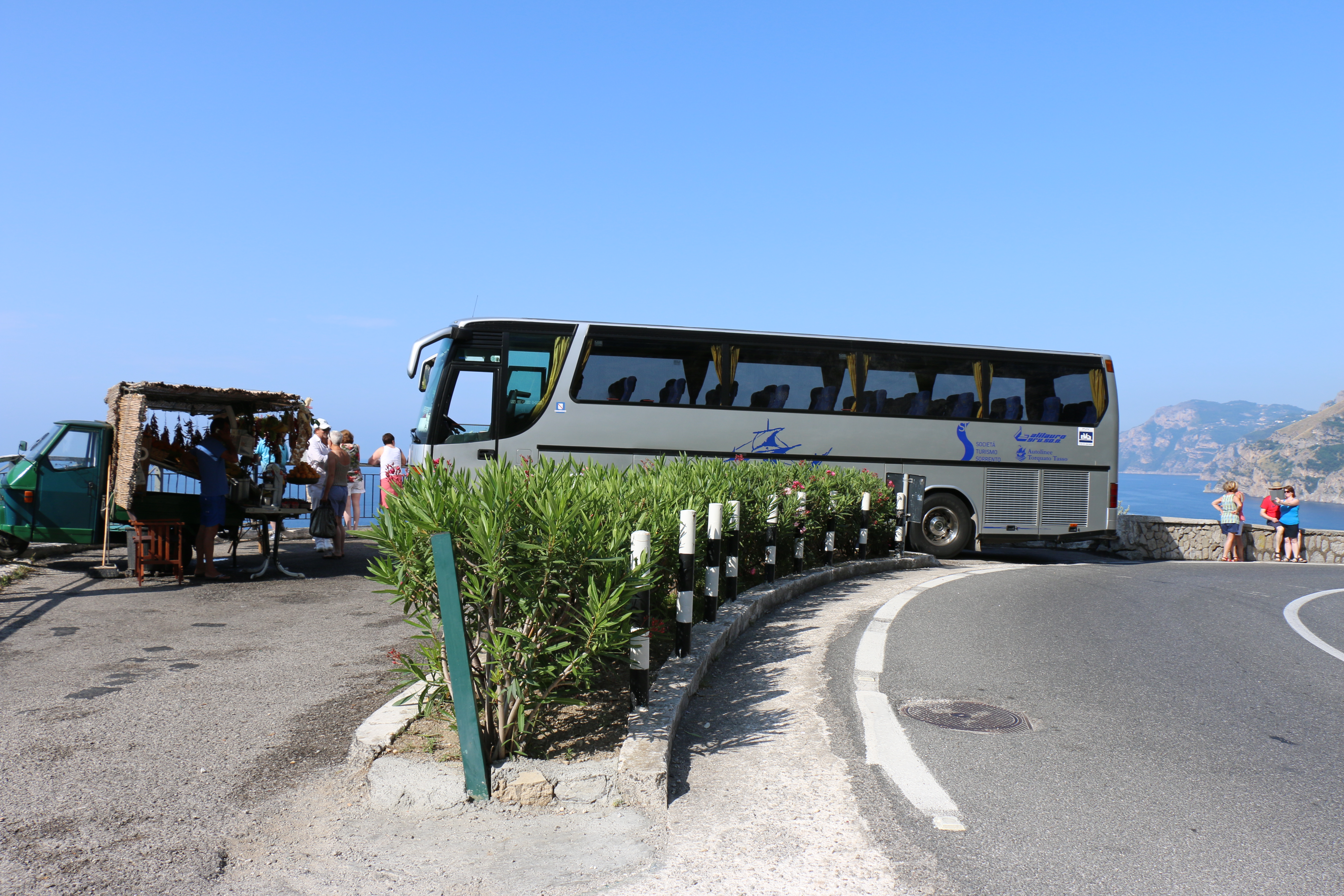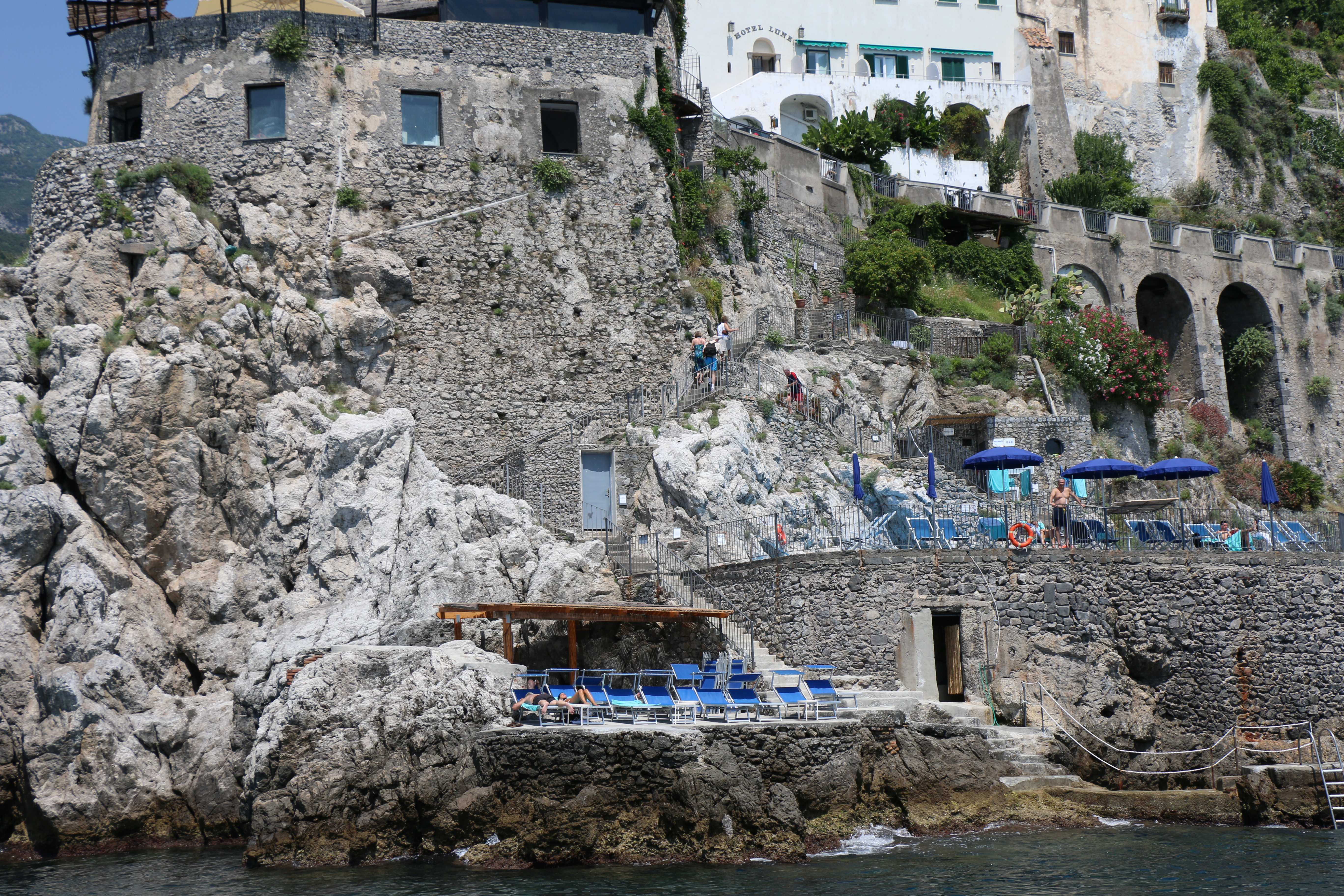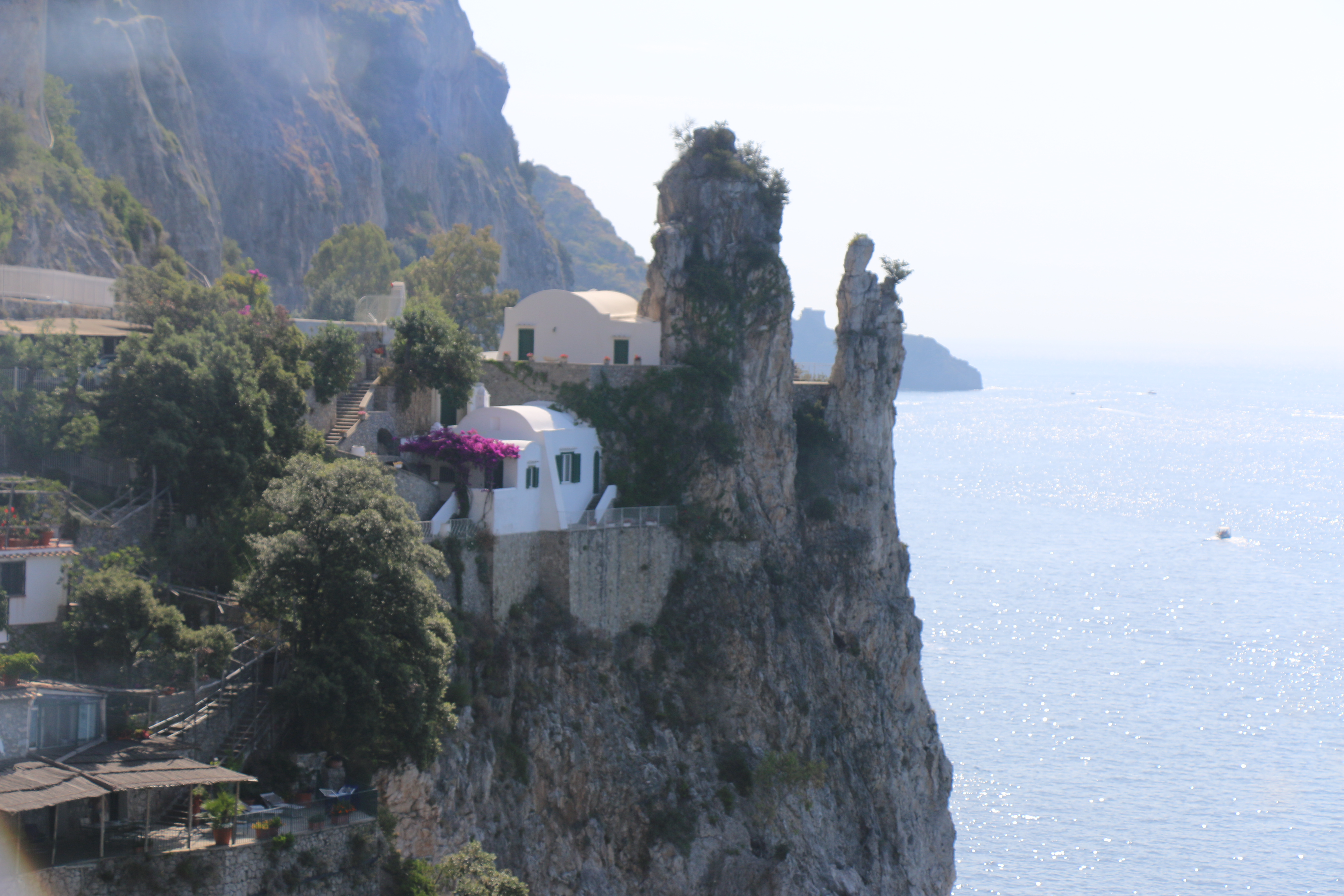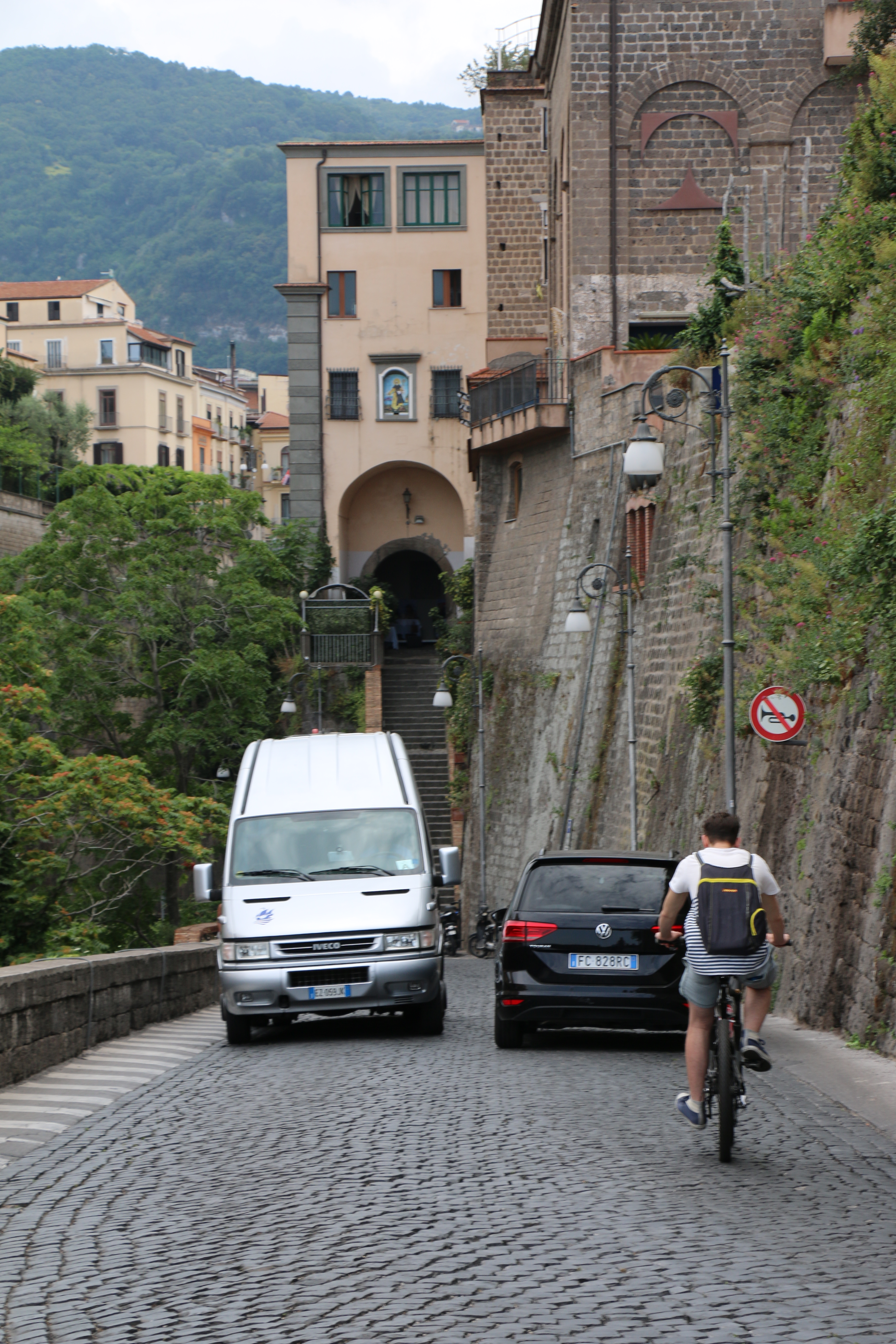 Saturday, the four of us (Hailey’s classmate Holly, Hailey, Michael and I) headed out at 9 am to have a Sorrento “Farm Experience”. We arrived at the lemon and olive orchard and were met by our guide, Claudia. She walked us through the orchard, providing lots of good information about the trees, showing us some that were over 200 years old. They do not use irrigation and she explained that the trees can survive on very little water if you never give them too much. Last year they only had 7 days of rain, but the orchard is covered in lemons! We then tasted their limoncello and seven flavors of olive oil, accompanied by some wonderful fresh lemonade. Once we were done with that, we were picked up by scooter trucks! These are vespas that have a golf cart-like passenger hauler placed on them. We were taken to the Restaurant and the family who owns the restaurant explained how their Pizze is made. We donned aprons and rubber gloves and were each given a ball of dough to work into a 12″ Marguerite pizze with sauce, tomatoes, mozzarella cheese, and basil. It was really fun, they played Italian music and each person had to throw their dough to the person across from them. Yes, a couple were dropped on the floor. But they just grabbed another ball of dough and carried on! We had to do it in shifts, but since the pizze’s are cooked for only 2 minutes at 800 degrees, it didn’t take long! It was delicious. We were then taken, by the same scooter/carts to the barns, where we met the dairy cows and were schooled on how mozzarella, ricotta, and cacciottine cheese are made. Claudia made small tomato and basil salads to go with our 3 kinds of cheese sample! Home made red wine was Included with the pizza and cheese sampling! It was especially nice to learn that all their products (i.e., orchards, cows and food ingredients) are completely certified organic. While very informative and fun, it was a very humid hot day, so we were all exhausted when we got back. It has become increasing clear why the Italians take pausa pranzo (lunch pause) every day! We have adopted this practice with ease.