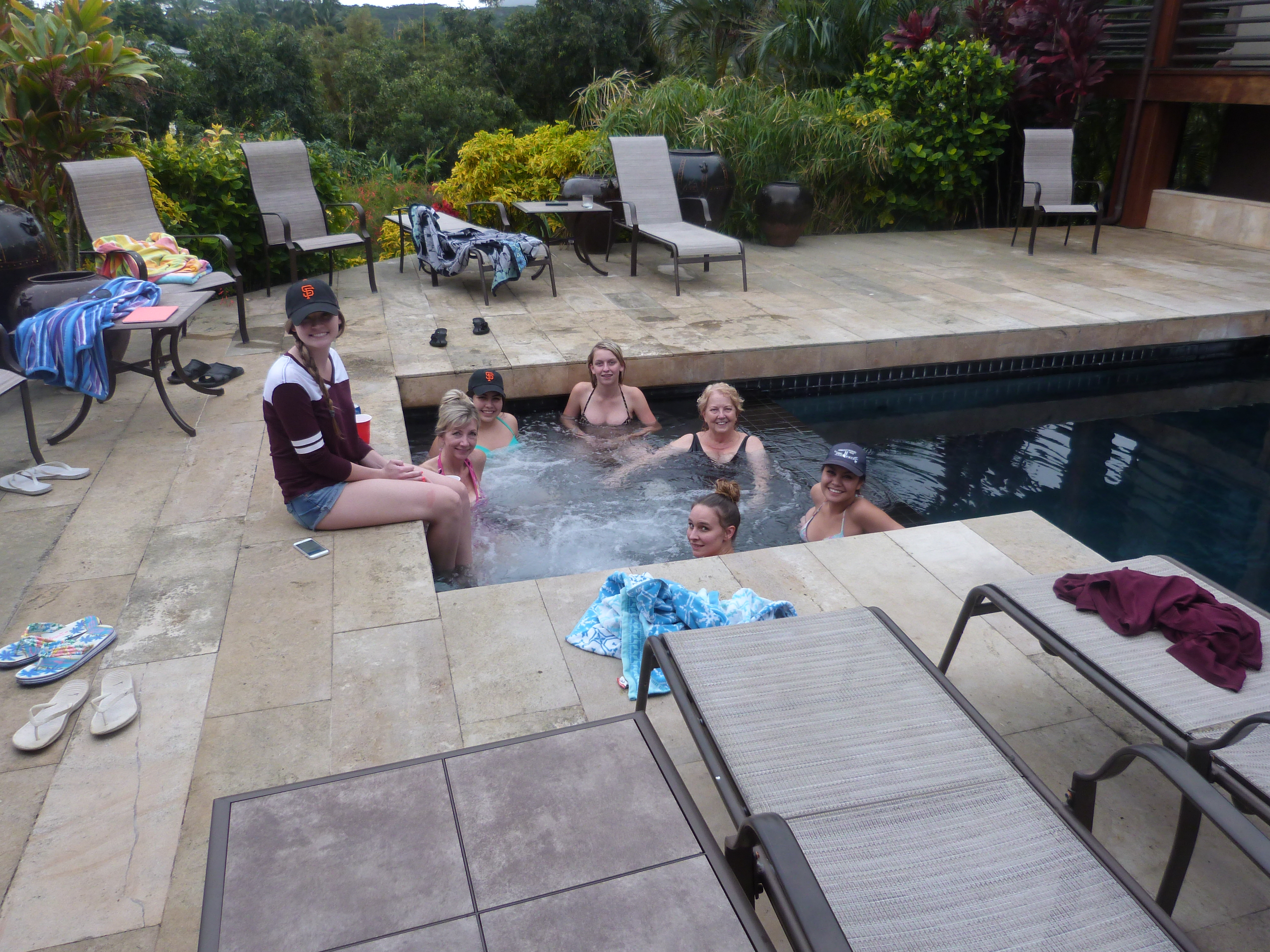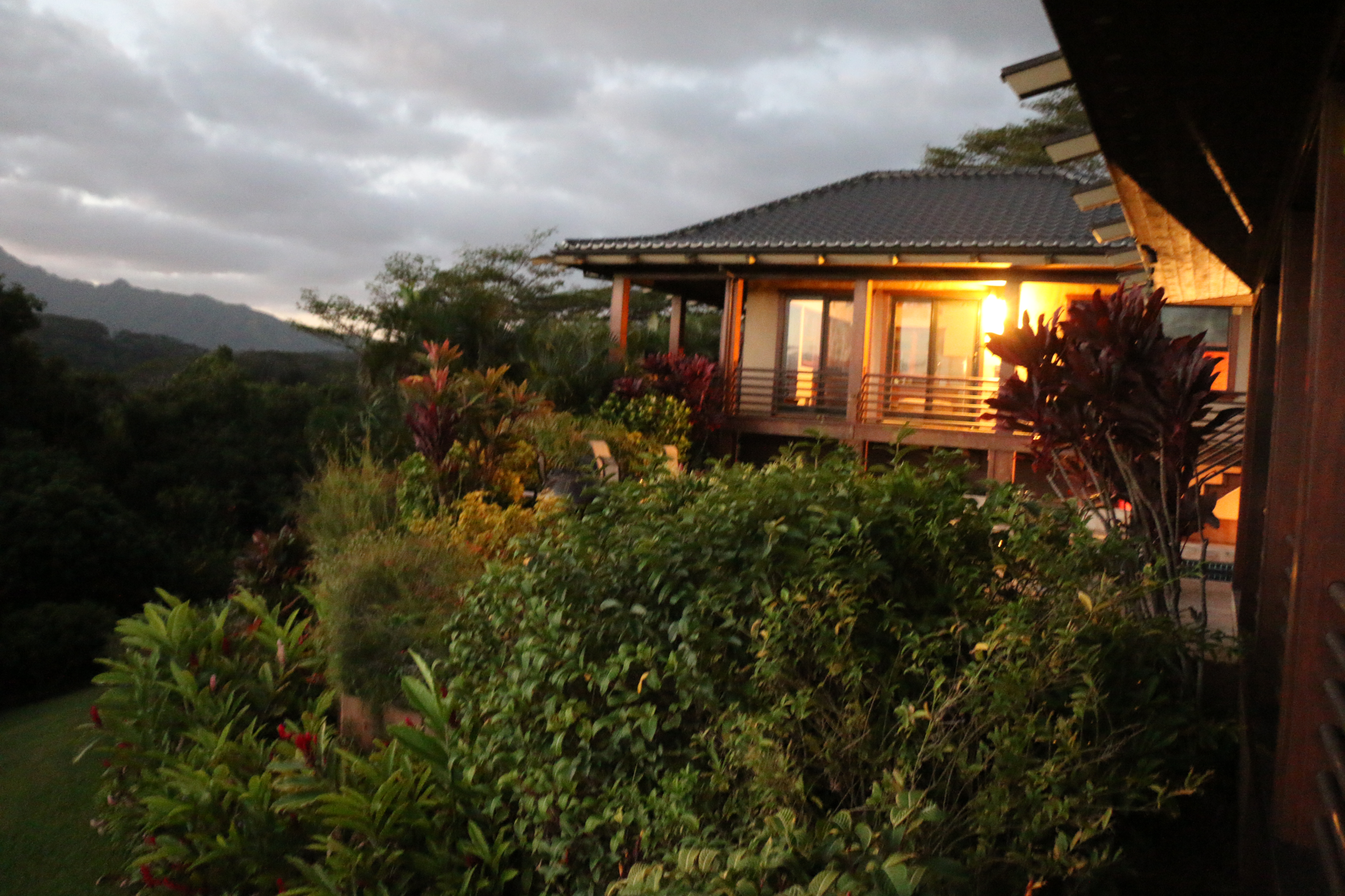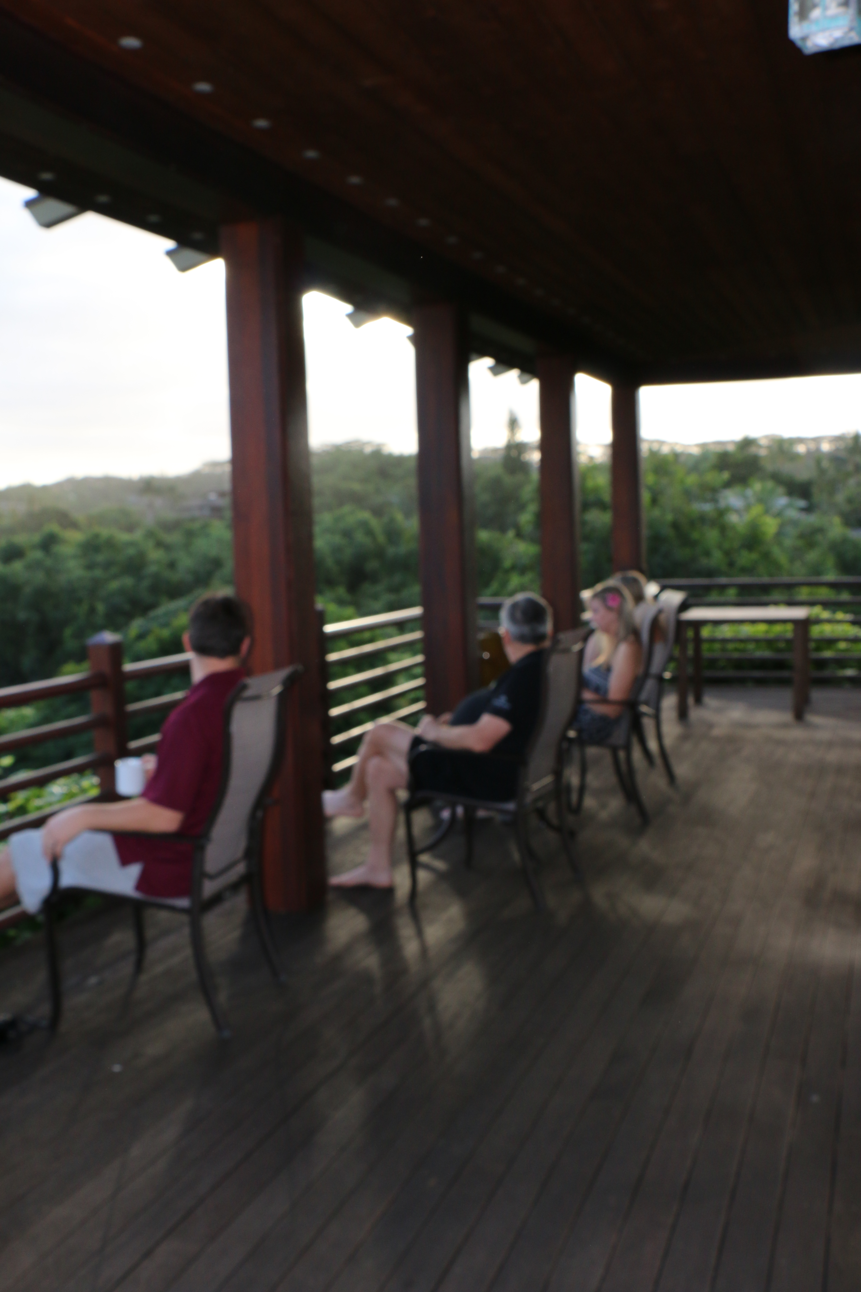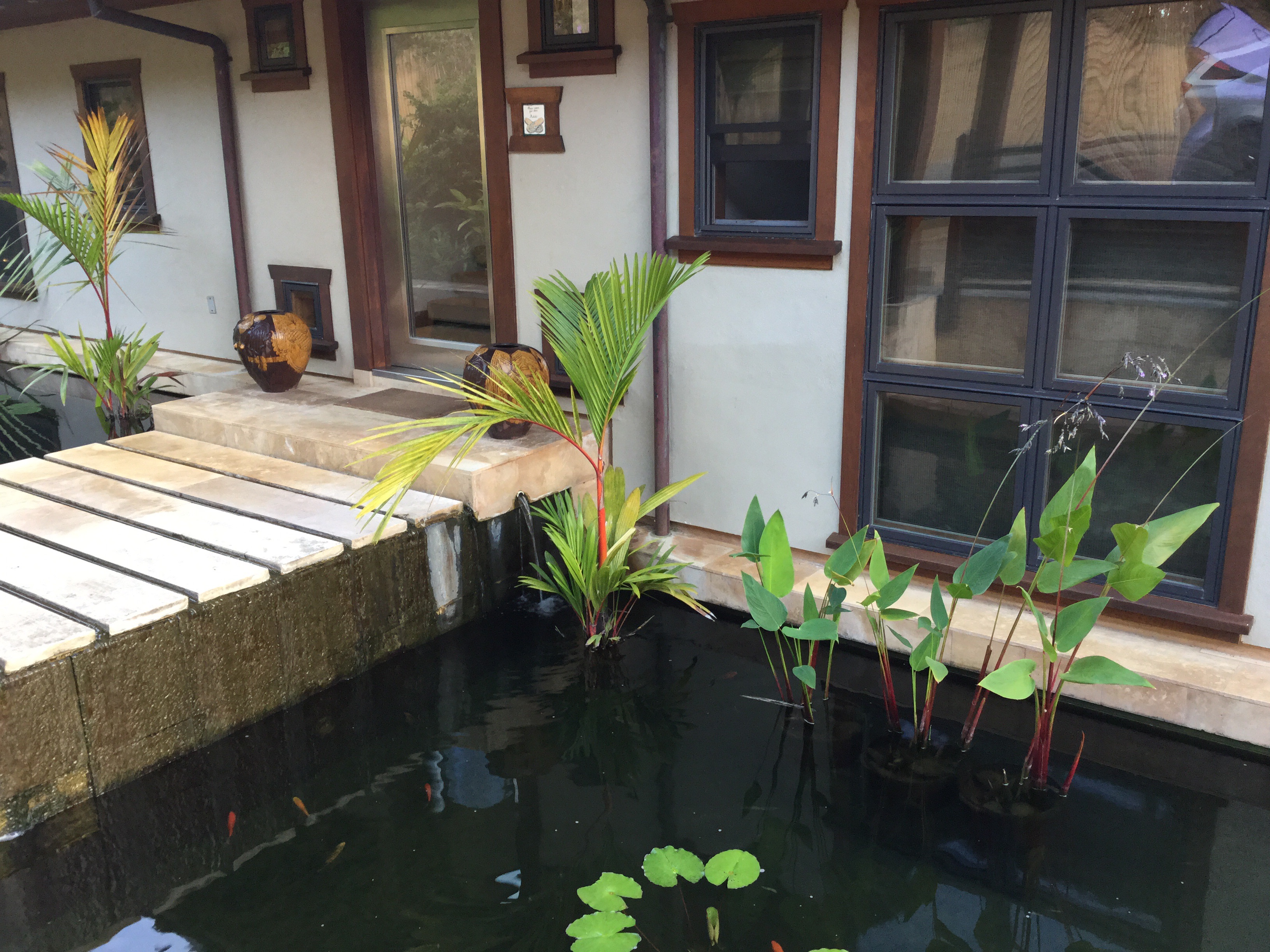 While we were gone, Jake drove all the kids to Kapaa to get dinner at the Noodle House – unfortunately, it was closed. So, they drove all the way back north to Hanalei to the pizza parlor. They got there at 7:30 and the pizza parlor stopped making pizza at 7 — Bad timing! But, wait, the men in the back were talking and it turned out that someone called in an order for 2 pizzas, but he had not picked them up. Would the kids be interested in taking these two pizzas for the price of one? Needless to say, the answer was YES! So they headed back to the house with their pizzas and Jake was walking over the entry steps (which cover the Koi pond and have inch-wide spaces between the steps) when he dropped the house keys in the pond! This is not a shallow pond we’re talking about. It is about 3 feet deep. Fortunately, one of the many sliding doors was left unlocked, so they got into the house and found some extra long tongs in the kitchen. With Jake stretched out on the steps and using the tongs, he was able to reach the keys! It was like an episode of Modern Family!