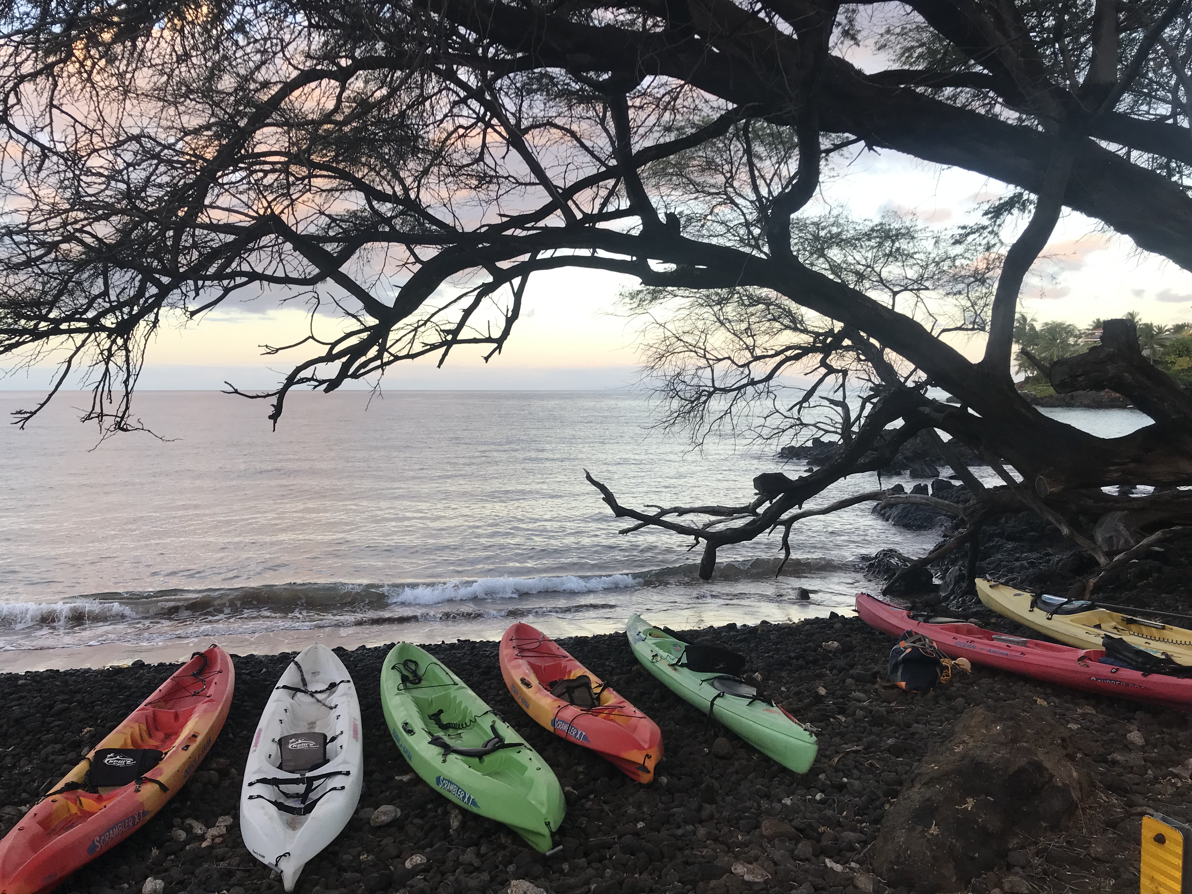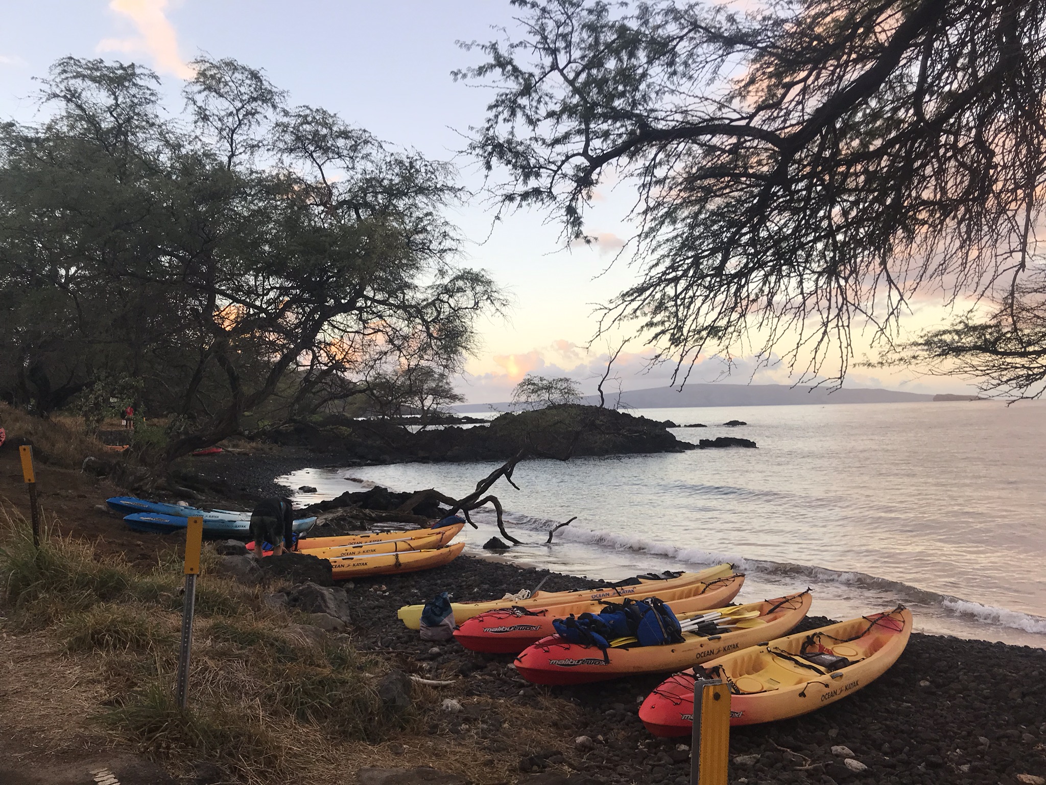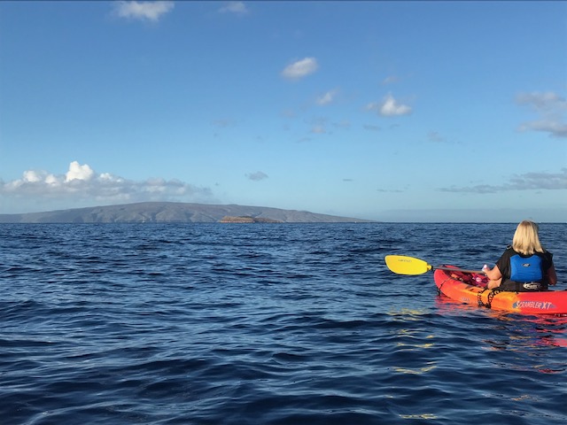 We had to get up at 5 am to drive the 50 minutes to Kihei to meet our Kayak guide at 7 am. It was dark when we left the condo and lightened up as we traveled south on the island. We met our guide, Greg, at Makena Landing Beach Park. This was a kayak/snorkel tour, so he spent a few minutes showing us how to get in and out of the kayaks while in deep water. I have never attempted this in the 16 or so years that I have been kayaking, so I was dubious to say the least. We were his only customers on this day, which was nice as we could choose what we wanted to do. We headed out toward open water and talked a little about whether we might see whales. We paddled a very long way – a mile straight out according to Greg. These were rental kayaks and as such, both Peter and I were pretty uncomfortable. Peter was having back issues and I was having hip issues. The seats were not what we’re used to, so that was one problem. Nonetheless, out we headed and when we saw a couple ‘blows’ in the distance, we all perked up and paddled a little farther to see if we could spot the whales. We did! They showed their backs and flipped their tails for us before taking a deep dive. We waited and watched and saw them again a bit later (or maybe another set of whales), but that was it for whales.