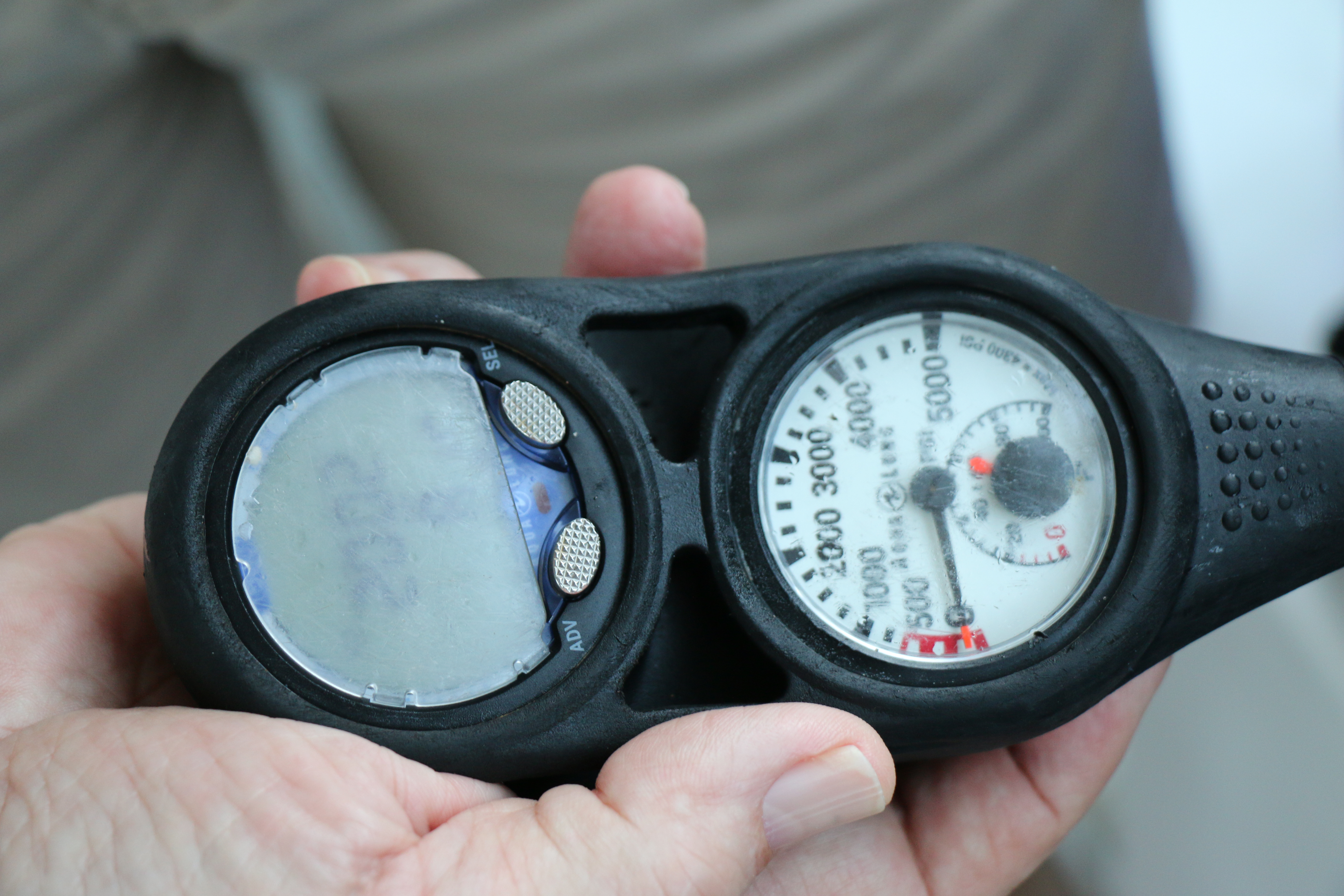 This is the regulator computer – tells you how much air you have, how deep you are and how long you have been under. This is your lifeline. We start at 3,000 lbs and must surface when it gets in the red. The air has not been turned on yet, so it shows 0 air. 3,000 lbs of air can last about 45 minutes if you are an efficient breather.